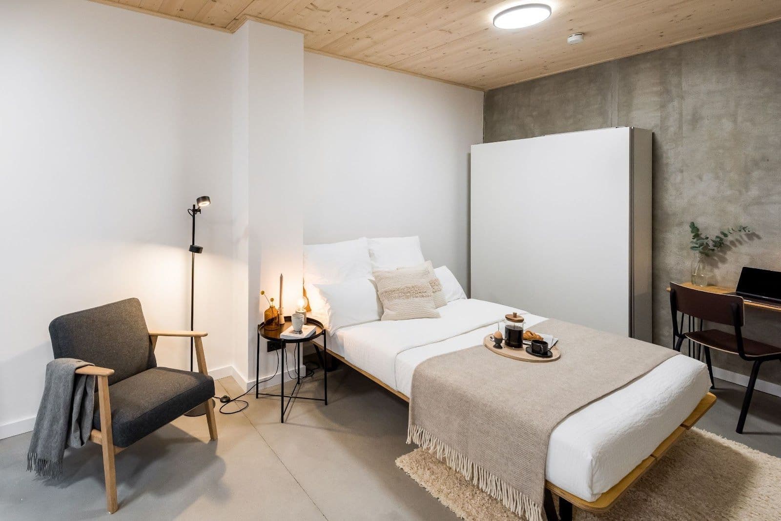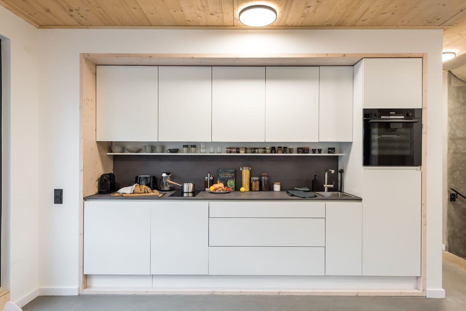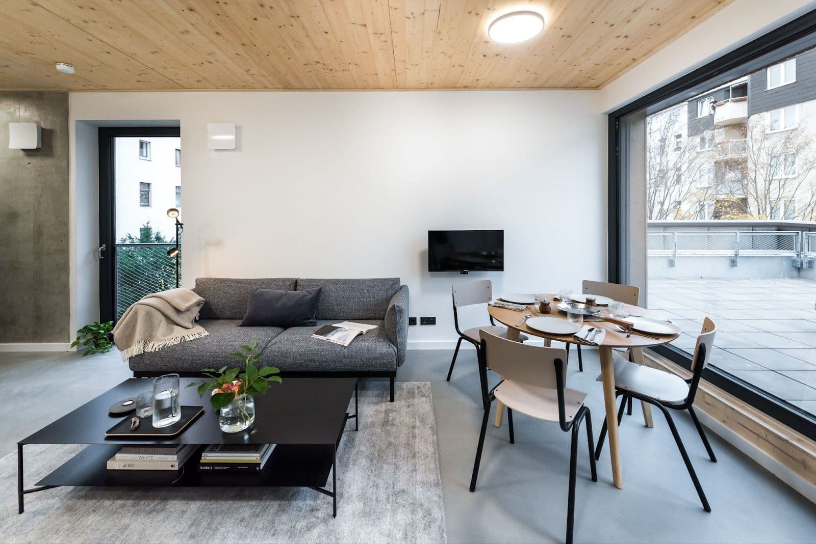 Inside, every room has large floor-to-ceiling windows providing great natural light to the living spaces and is fully furnished and equipped. The design of the interior is truly outstanding, with ceilings made up of wood panels, and floors - of modern, minimal concrete, with built-in heating. It’s a true place of tranquility in busy Berlin. Inside, the property also features unique bathrooms from Tjiko - an innovative company developing and producing pre-assembled bathroom modules in wood construction frames.